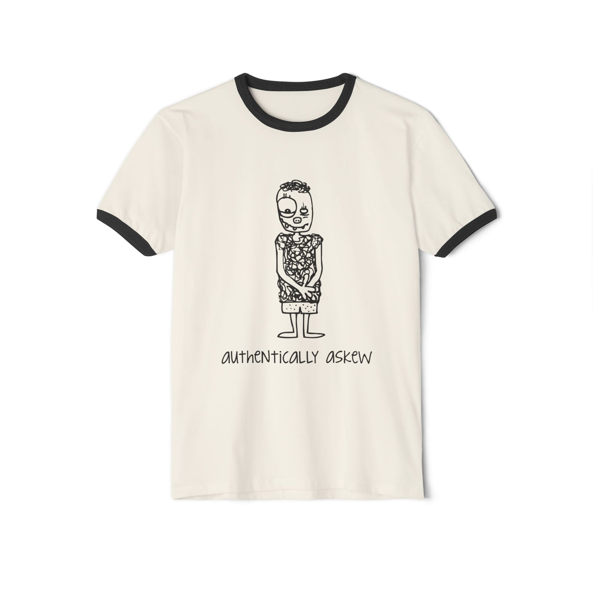 This soft ringer tee carries a quiet, hand-drawn soul — a slightly offbeat sketch of a character and the words “Authentically Askew” that feel honest, gentle, and oddly comforting. Lightweight cotton and contrasting collar and sleeve bands give it a vintage-revival look that reads casual but considered. Wear it on slow mornings with rolled jeans, or layered under a denim jacket for city days when you want to say a little about who you are without shouting. The slim classic fit and tear-away label keep the focus on comfort and that understated, artful graphic.