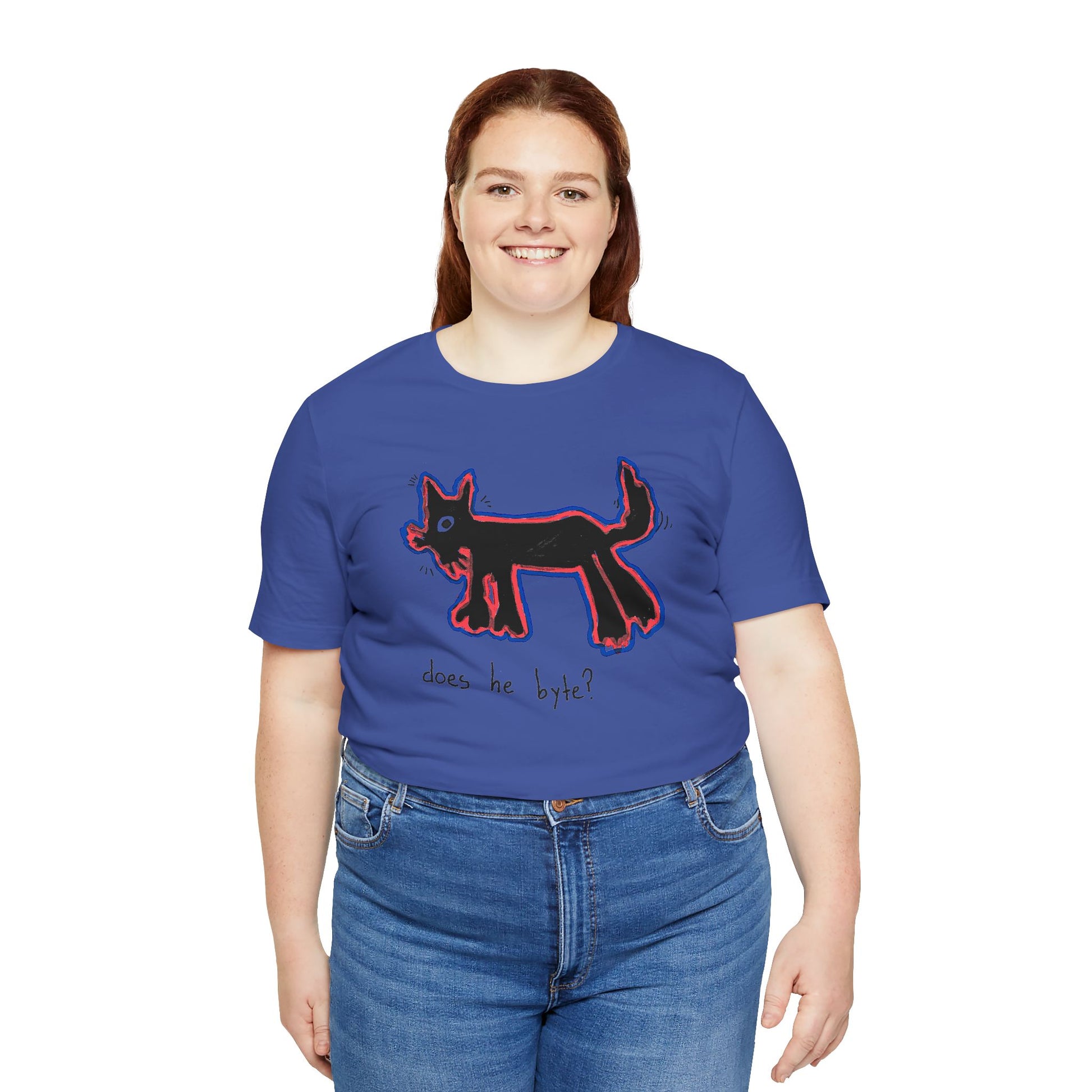 A lightweight, lived-in tee that carries a wink of weird and a whole lot of personality. The soft Airlume combed cotton feels breathable against the skin and layers easily beneath jackets or over hoodies. Front artwork shows a hand-drawn, slightly glitchy black dog outlined in vibrant, off-register colors with the handwritten caption “does he byte?” — a playful, low-fi tech-humor vibe that sparks smiles and conversations. The crew neckline and retail fit keep the silhouette clean and wearable, while side seams and shoulder tape help the shirt hold its shape through repeat wear. Wear it to coding sessions, casual meetups, or low-effort weekend hangs when you want clothing that’s comfy, ethically made, and distinctly offbeat.