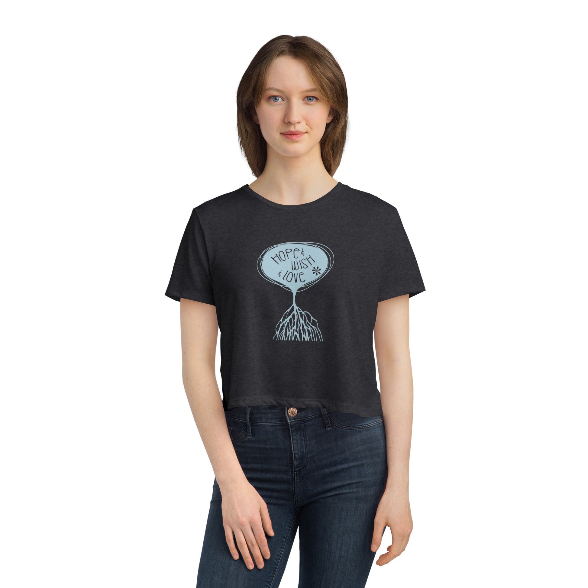 Light, airy, and quietly expressive — this flowy cropped tee carries a hand-drawn seedling graphic that reads “Hope + Wish + Love.” It settles softly at the waist with a modest crop and tailored sleeves that balance relaxed movement with a flattering silhouette. Breathable, lightweight fabric drapes easily over warm-weather layers or pairs with high-waist jeans for weekend markets and late-afternoon coffee walks. Wear it when you want your outfit to feel gentle and intentional — a small everyday reminder to tend what matters.