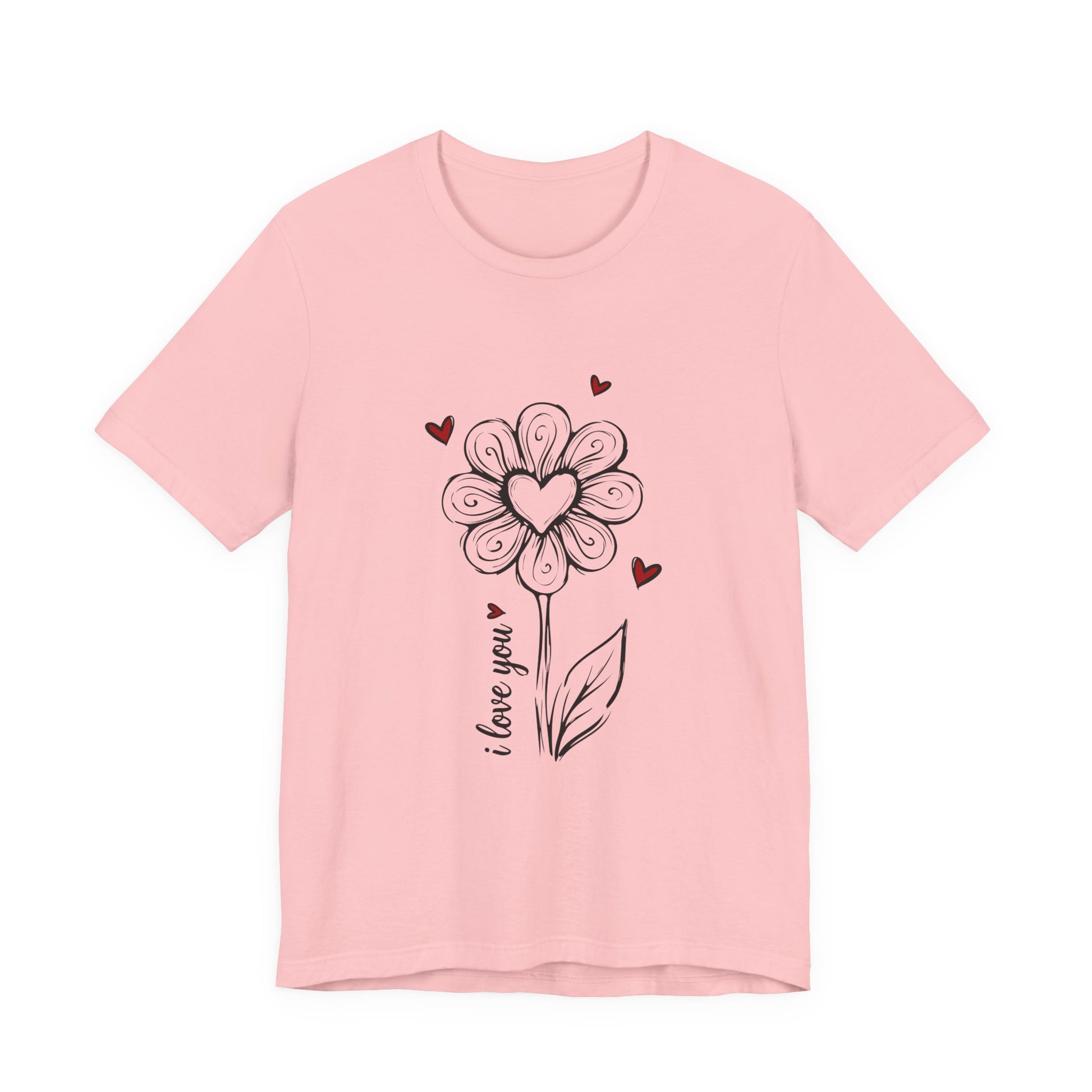 Lightweight, soft, and breathable, this crew-neck tee brings a gentle, hand-drawn charm to everyday wear. A sketched flower with a heart-centered bloom and tiny red hearts sits just off-center on the chest, with a delicate handwritten “i love you” along the stem. The slim retail fit and ribbed knit collar keep the silhouette neat while side seams and shoulder tape maintain shape through repeated wear. Made from Airlume combed and ring-spun cotton for a smooth feel against the skin, the tear-away label reduces irritation so the shirt stays comfortable all day. Ethically produced with REACH compliance and responsible manufacturing, this tee reads like a quiet, wearable note — casual enough for daily life, thoughtful enough to carry meaning.