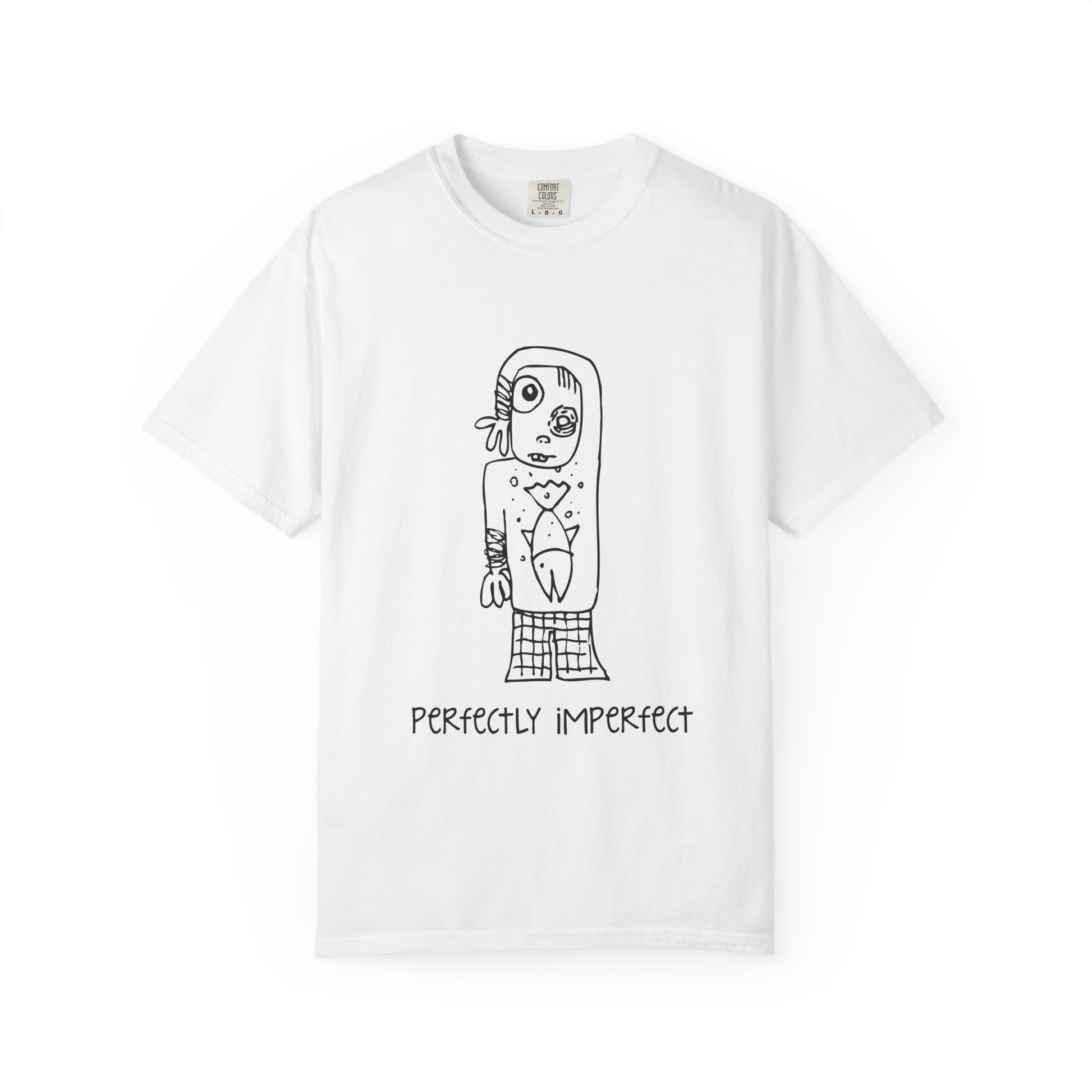 Embrace the beauty of the unconventional with a tee that celebrates quirks over conformity. This design features a whimsical, sketchbook-style character—complete with mismatched eyes, a fish-bone tie, and checkered trousers—anchored by the handwritten mantra, "PERFECTLY iMPERFECT." It is a charming, visual reminder that our flaws are what make us interesting. To match the raw, authentic vibe of the artwork, we’ve printed it on a premium Comfort Colors 1717 base. The heavyweight, 100% ring-spun US cotton feels substantial yet broken-in from the very first wear, offering a structured look that doesn't cling. Whether you are an artist, a dreamer, or just someone having a messy hair day, this shirt is your comfortable companion for showing up exactly as you are.